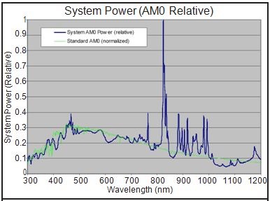 上圖顯示了努美科技/Sciencetech全反射太陽(yáng)能模擬器的典型輸出光譜。這些光譜輻照度曲線結(jié)合了氙弧燈光源,空氣質(zhì)量過(guò)濾器和太陽(yáng)模擬器光束均化器內(nèi)部使用的反射鏡的光譜曲線。